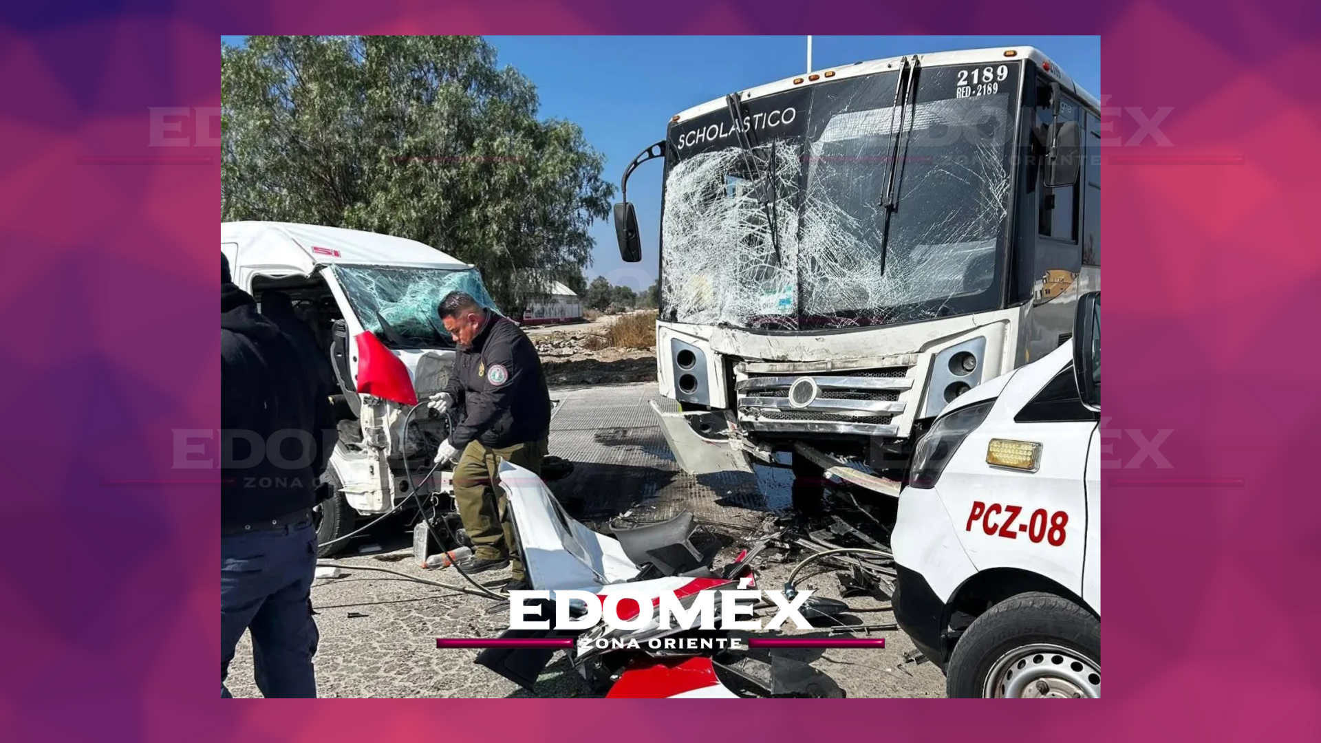 En el accidente se vieron involucrados un autobús de transporte de trabajadores de la empresa Schoolástico, con número económico 2189, y una camioneta de transporte público de la línea Grupo AAZ “Brujas”, identificada con el número económico 51.
