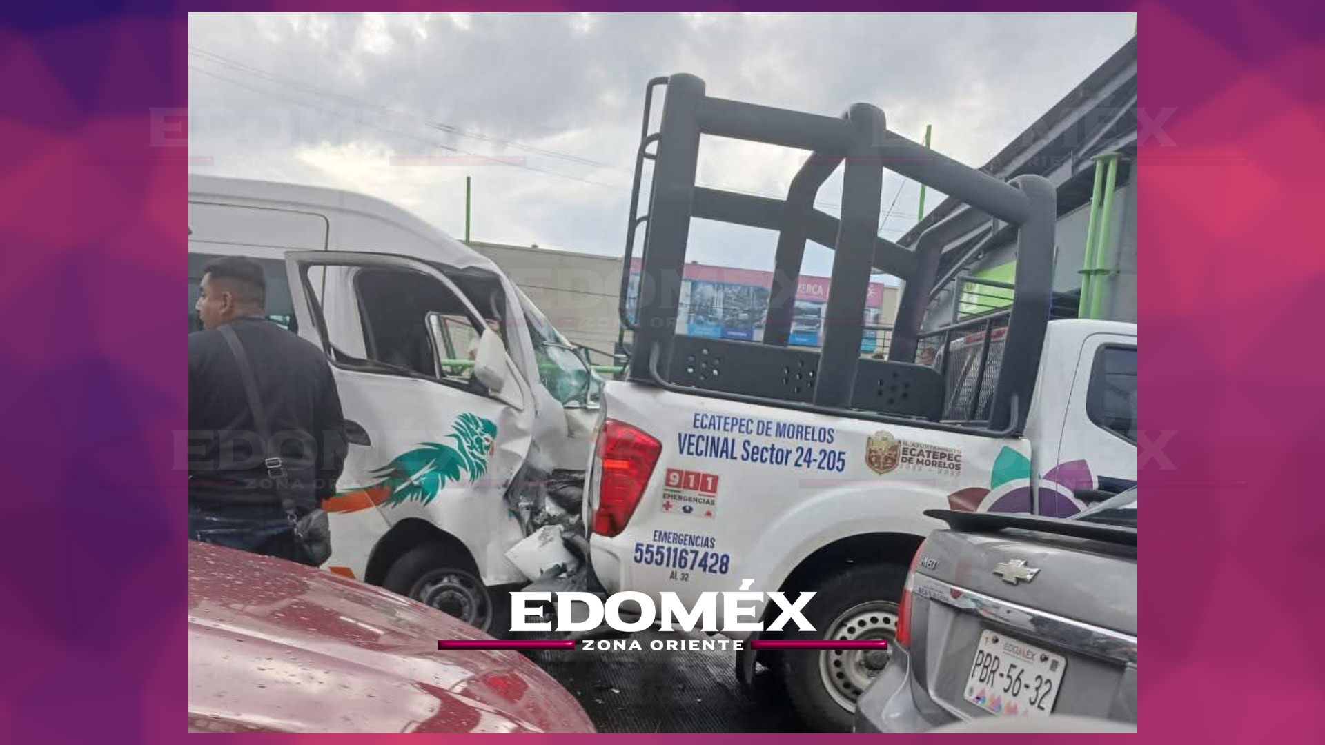 Esta tarde se registró un fuerte accidente sobre la avenida Central, a la altura de la estación del Mexibús Alfredo Torres, donde una Urvan se impactó contra una patrulla de la Policía Municipal de Ecatepec.