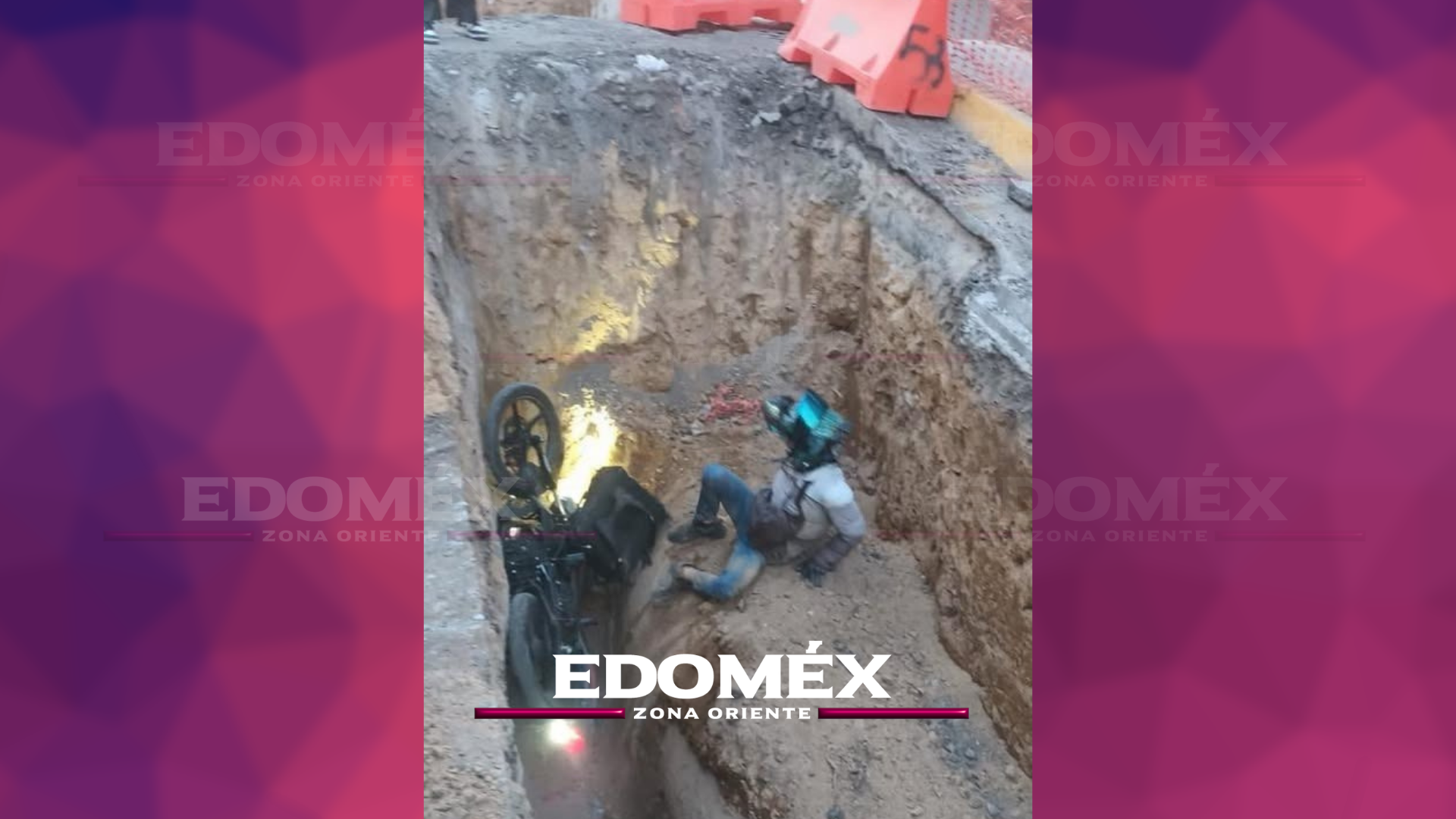 Un motociclista perdió el control y cayó en un hoyo abierto en las inmediaciones de una sucursal de Bodega Aurrera, en Los Reyes La Paz, #EdoMéx.