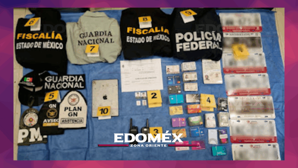 En el lugar se aseguraron placas de circulación, equipos de radiocomunicación, una caja con identificaciones oficiales e insignias de corporaciones como la Guardia Nacional, SEDENA, Policía Ministerial y la Fiscalía de la CDMX, además de prendas con logotipos de la Fiscalía del Estado de México, Guardia Nacional y Policía Federal.