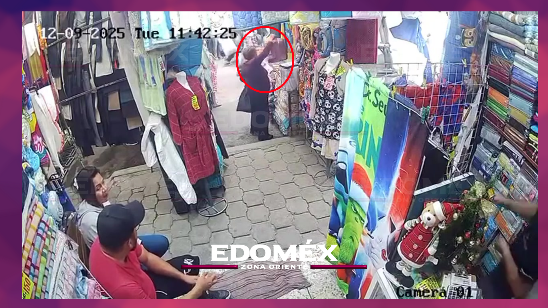 En el video se observa cómo la mujer toma la colcha mientras un hombre de rojo y otra mujer de gris la cubren para evitar que el dueño del puesto se percate. Tras el robo, los tres se retiran del lugar sin levantar sospechas.